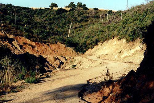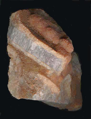 Hier fand der Autor mehrere Belegstücke des Calciumcarbonats Calcit, in massigen Brocken von bis zu 9 x 7 cm Größe. Einige dieser Brocken weisen eine offensichtlich ältere Generation auf, die einen durch vermutlich Eisen/- Manganoxide/-hydroxide verfärbten Rasen aus winzigen Rhomboeder-Kristallen zeigen; darüber befindet sich eine jüngere Generation aus ebenfalls bräunlich verfärbtem Calcit in warzig-knolliger Ausbildung mit kristallinen Partien von bis zu 4 x 2 cm Größe. Die kalkigen Lagen umschließen dabei zum Teil ein metamorphes Gestein - vermutlich Schiefergneis - der eine deutlich vertikale Schichtung zeigt.
