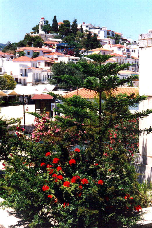 Die Hauptstadt der Insel ist die Stadt Skiathos. Wenn man sie vom Nordosten mit dem Schiff anläuft, liegt sie dem Betrachter in ihrer strahlenden Schönheit mit weißgetünchten amphitheatrisch angeordneten Häusern zu Füßen. Sie wurde 1829 an der Stelle der antiken Stadt gebaut und ist heute ein berühmtes touristisches Zentrum. Hier lebt fast die gesamte Inselbevölkerung, abgesehen von ganz wenigen verstreuten Ansiedlungen.