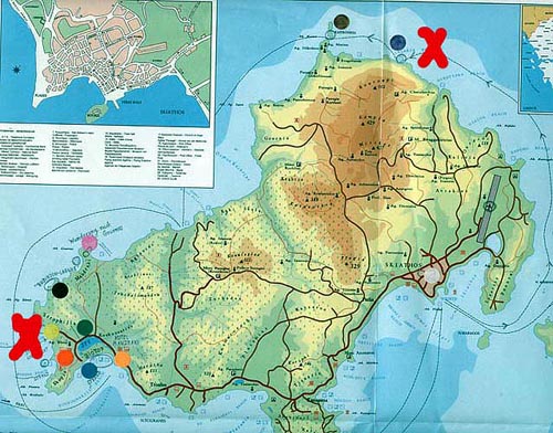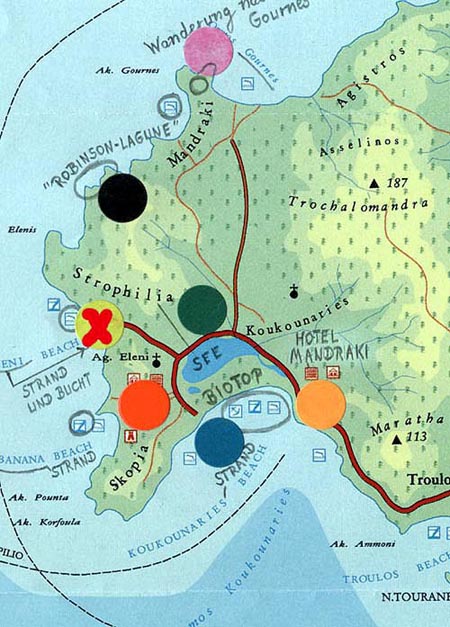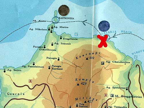 Weitere Mineralfunde konnte der Autor, anlässlich eines Bootsausfluges mit mehreren Zwischenstopps am 12.6.1997 zwischen zwei aus Kalkstein bestehenden größeren Felsbrocken am malerischen Lalaria-Kieselstrand tätigen. Dabei erreichten die für eine nähere Betrachtung in Frage kommenden Felsbrocken einen Durchmesser von ungefähr 1 x 1 Meter.