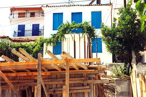 Im Westen tritt basales paläozoisches Kristallin als voralpidischer Unterbau zutage, vornehmlich bestehend aus Muskovitschiefer, Granatglimmerschiefer und Zweiglimmergneisen (FERENTINOS 1973). Diese von SKALA und JAKOBSHAGEN (1977) als “Skiathos-Serie“ bezeichnete Schichtfolge wird im Hangenden an manchen Stellen von Konglomeraten gekappt, die lokal ein Kleinrelief in den Schiefern ausfüllen und auf fluvialen Transport (Schichtfluten?) hinweisen (JAKOBSHAGEN und SKALA 1977, S. 238).