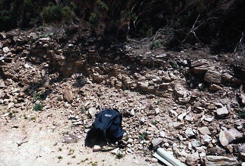 Hier arbeitete der Autor mit schwerem Hammer und Flachmeißel mehrere auffallend schwarz-grün verfärbte Belegstücke bis zu maximal rd. 6 x 5 cm Größe aus dem Felsgestein heraus.