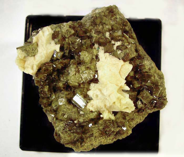 Eine Fußballgroße Druse lieferte neben dem großen Calcit einige Stufen mit Biotit/Chlorit-xx mit aufgewachsenem Calcit.