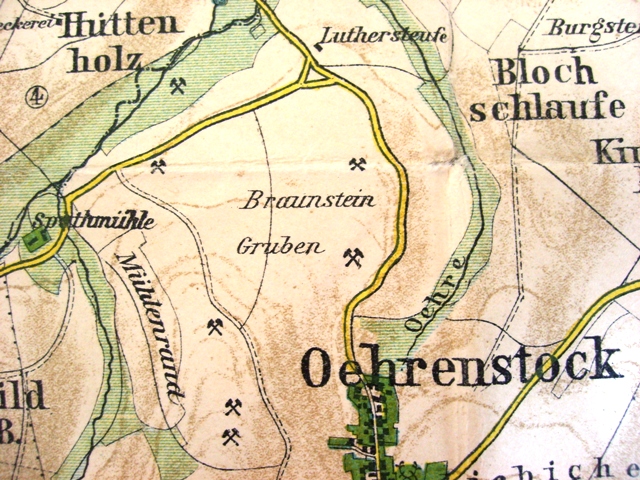 Das Manganerzrevier Oehrenstock bezieht sich meist auf die vielen kleinen Baum- und Buschbewachsenen Haldenzüge entlang der Feldergrenzen. Jedoch sollte man wissen, dass es da noch viel mehr Fundstellen gab. Größte Berühmtheit erlangte wohl der Tragberg, wo dort der Hausmannit in 1-2 Zoll großen Kristallen vor kam.