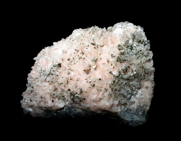 Die Abbildung zeigt eine schöne Kleinstufe mit rosafarbenen tafligen Rhodochrosit-Kristallen, in Begleitung von Bertrandit und Fluorit, aus Kounrad in Kasachstan.