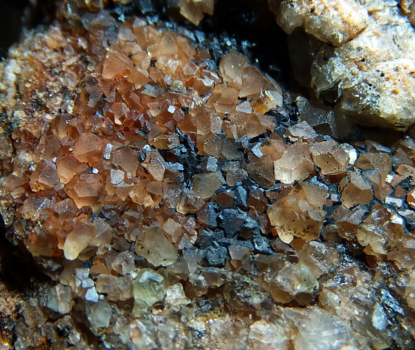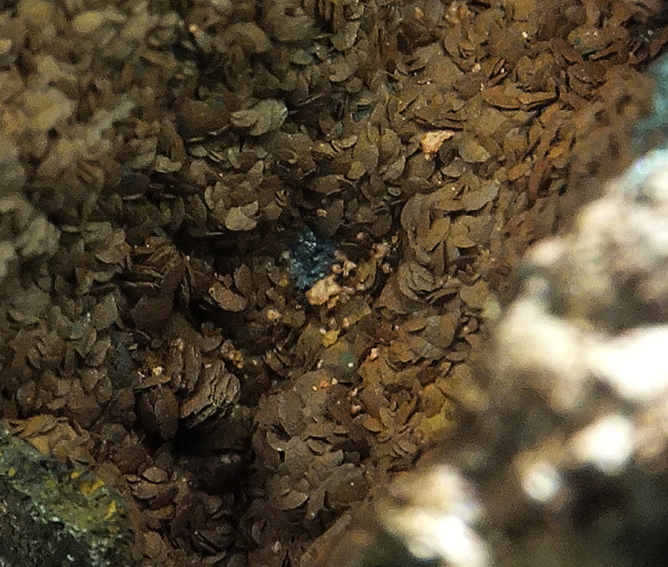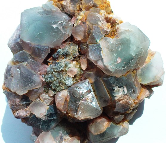 Auf dem zweiten Foto von oben meine ich überwiegend Fluorit-Oktaeder zu erkennen. In den Zwickeln dazwischen könnte auch noch dunkelblau metallisch-glz. Covellin oder Chalkopyrit sitzen; auch z.T. als Überzug auf einigen Fluorit XX. Aber alles ohne Gewähr.