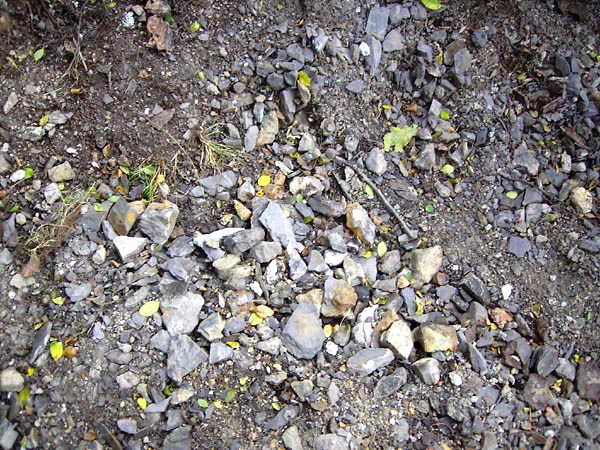 Erst vor ein paar Jahren wurde mir auf einer hessischen Mineralienbörse auch noch schwarzer Tonschiefer mit reichlich schönen roten Zinkblende-Kristallen von dieser Fundstelle angeboten. Neben noch reichlich Diabas-Brocken konnte ich am Exkursionstag auch noch zahreiche Stücke dieses dunkelgrauen bis schwarzen Tonschiefers vorfinden (allerdings leider ohne die gewünschten Zinkblende xx). Dafür wurden wohl im Laufe von Jahrzehnten die Halden auch einfach schon zu oft durchwühlt und umgegraben.