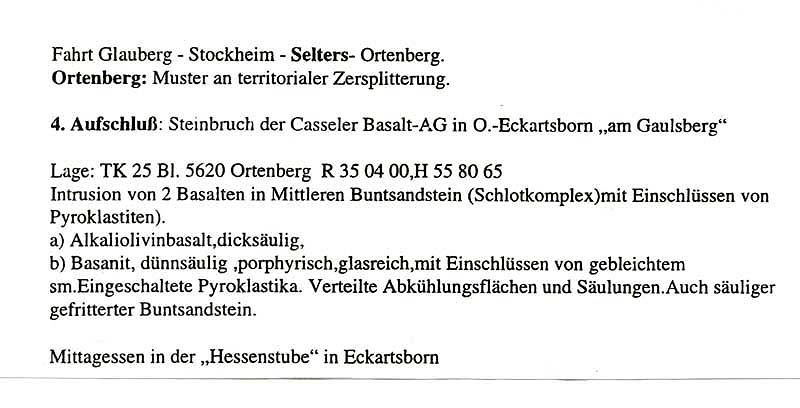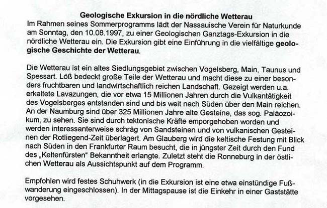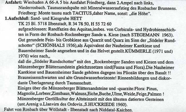 mit den folgenden "Text-Tafeln" (= Auszüge aus dem Exkursions-Programm des Exkursionsleiters und Geologen Dr. Witigo Stengel-Rutkowski) und mit den jeweils dazugehörigen Bildern, möchte ich Euch an meinen Eindrücken zu dieser gelungenen Exkursion in die Wetterau (Vogelsberg) v. August 1997, teilhaben lassen!