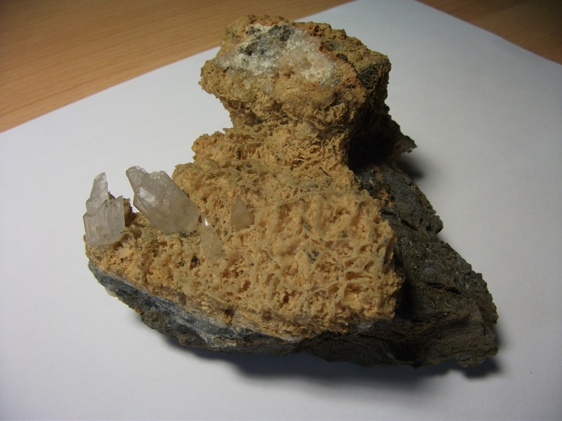 Gips - verbreitet als dünne Gängchen im Tonschiefer, manchmal zu "Blechen" aus Kristallen verdickt