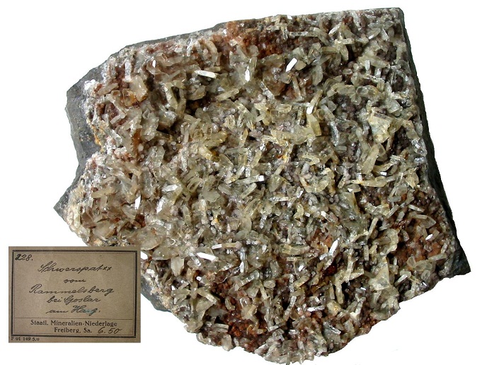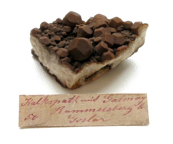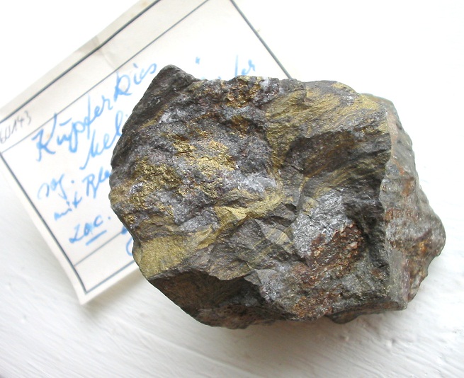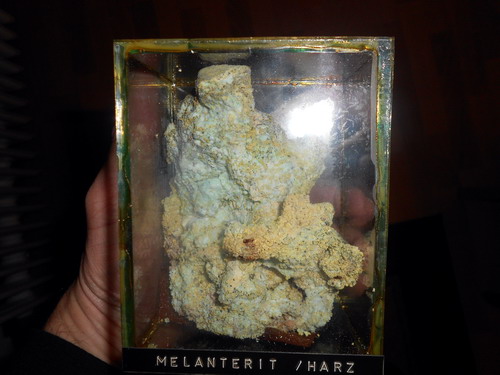 Nun möchte der Mineraliensammler zwar gern etwas von der Montangeschichte erfahren, aber in erster Linie möchte er doch den Hammer schwingen. Gleich vorweg gesagt sei, dass der stecken bleiben sollte! Der Rammelsberg ist, wie fast der ganze Harz, Natur- und Landschaftsschutzgebiet. Aber auch so kann man mit etwas Glück und Geschick noch das ein oder andere finden, so man die Ansprüche nicht zu hoch schraubt. Nachdem man sich vielleicht die erste Führung des Tages gegönnt hat, wandere man in Richtung Goslar zurück. Gegenüber eines Hauses, auf dessen Dach das Wort "Glückauf" steht, zweigt eine Straße den Berg hinauf, die zu einer Jugendherberge und weiter zum Ausflugslokal Maltermeister Turm führt. Es ist ein schöner Weg hinauf und bald schon sieht man riesige Halden, die weit den Rammelsberg hinaufziehen. Dies ist der Ausbiss des Alten Lagers, des ersten Erzlagers, welches abgebaut wurde. Das Erz untertage wurde im "Neuen Lager" gefördert. Die Halden sind Technisches Denkmal, worauf in gut beschriebenen Hinweistafeln auch Bezug genommen wird. Ohnehin handelt es sich um taubes, eisenschüssiges und stark verwittertes Material. In den Entwässerungsrinnen der Straße, welche an den Halden vorbeiführt, sollte aber auf kleine Calcit-Spaltkristalle geachtet werden, die z.T. kleine Erzputzen von Chalkopyrit, Galenit und Sphalerit enthalten können. Auch ein Schieferstückchen, das mit einer traubigen Smithsonitkruste überzogen war, habe ich dort finden können. Weiter geht es bergauf, bis man vor dem Lokal steht. Unterhalb, direkt am Parkplatz erkennt man anstehenden Schiefer, der stark in der Verwitterung begriffen ist. Je nach Witterung - in den letzten drei Jahren hatte ich leider kein sonderliches Glück mehr - blühen hier Sulfate aus, die aus im Schiefer enthaltenem Pyrit entstehen. Pyritknollen fanden sich direkt gegenüber am Schieferaufschluss (Wissenbacher Schiefer) neben dem Naturfreundehaus. Heute ist davon nichts zu sehen, aber es riecht bisweilen noch stark nach Schwefel dort. Am erstgenannten Aufschluss konnte ich vor drei Jahren noch eine umfassende Paragenese bergen. Vorweg: am besten hingehen, wenn das Lokal geschlossen ist, ansonsten popelt man direkt unter den Augen der Ausflugsgäste und direkt neben deren Autos im Anstehenden herum.