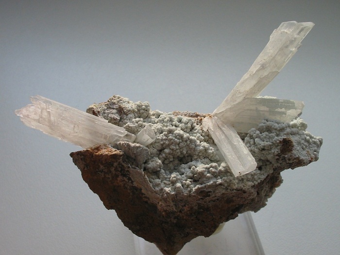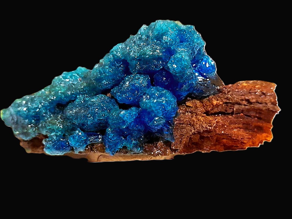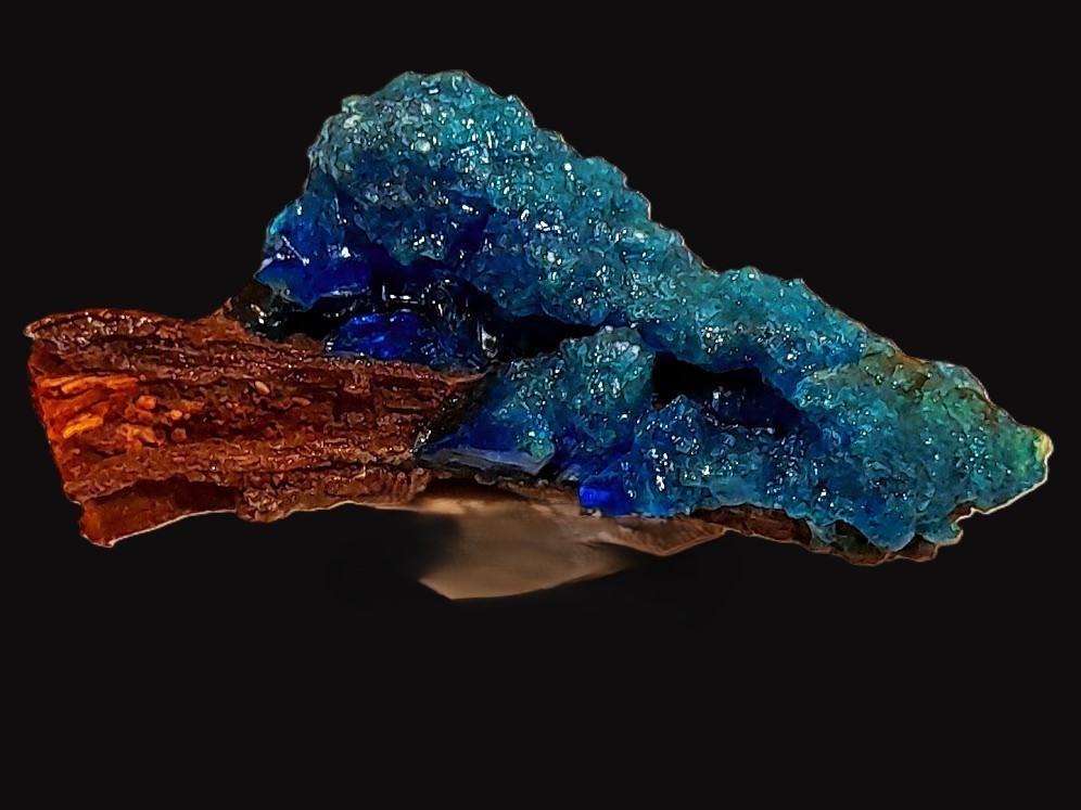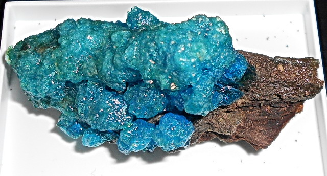 Devillin - gebogene, manchmal spanförmige hellblaue Kristalle auf Chalkanthit (selten und leicht zu verwechseln)