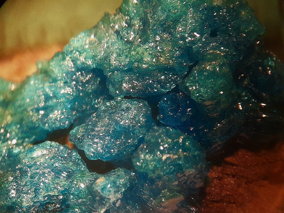 Antlerit - dunkelgrüne winzige xx zumeist auf Chalkanthitkrusten aufgewachsen