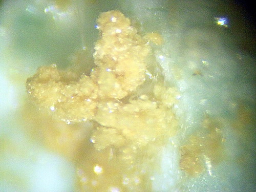 Grundlage für meinen ersten Besuch war ein alter Artikel im "Aufschluss", der besagte, dass unterhalb des Maltermeister Turmes Sulfate vorkämen. Beschrieben wurden weißliche Kristalle von Goslarit (Typlokalität liegt im Roederstolln siehe oben!), grüne Beläge von Melanterit, welche mitunter winzige kräftig grüne Antleritkristalle trügen. Alle genannten Minerale habe ich so auch auffinden können. Ein Jahr später kam es noch besser. Mit einem Schraubenzieher hob ich die obersten Schichten des Schiefers ab. Darunter war das Gestein durch eingesickertes Wasser noch feucht und begünstigt durch die dem Regen folgende Julihitze hatten sich bunte Sulfatkrusten gebildet. Ich nahm das Material ohne weitere Vorortuntersuchung mit und zerlegte daheim alles in Mikromounts und Kleinstufen. Einiges, was ich nicht selbst bestimmen konnte, gab ich zu "Harz-Spezialisten" zur Begutachtung. Heraus kam eine umfassende Paragenese, die ich aber leider (siehe oben) so nie wieder antreffen konnte.