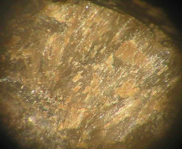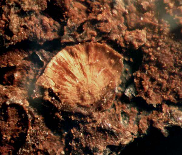 Besondere Hinweise: Das nachfolgend abgebildete Mineral stellt einen Eigenfund während der Exkursion mit dem NVN vom 12.7.1997 dar. Es könnte sich entweder um ein fächerförmiges Aggregat von Anapait oder aber auch sogar von Kakoxen handeln. Bildbreite 4 mm.