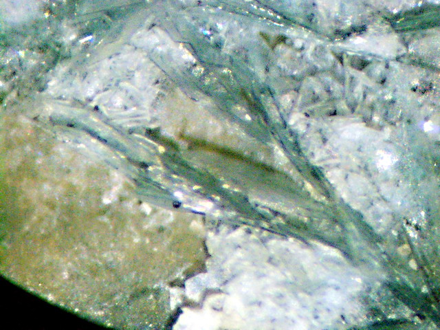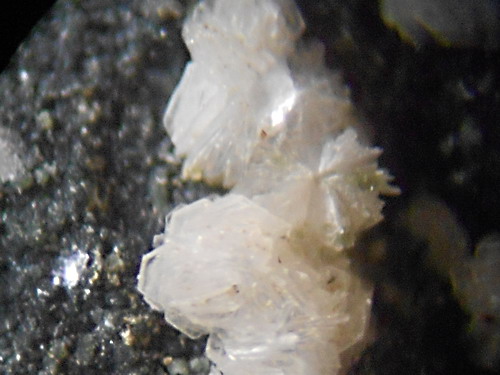 aus Klüften im Amphibolit neben Aragonit-Kristallen bis 10 cm (!) und ausgezeichneten Prehnit-Stufen,