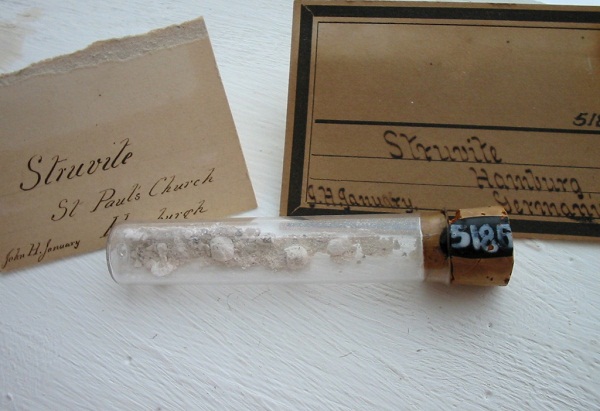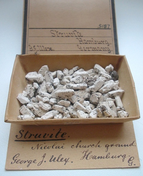 Struvit (ein recht seltenes Phosphat mit der Formel NH4Mg[PO]4*6H2O) wurde im Jahre 1846 beim Grundbau der St. Nikolai Kirche in Hamburg entdeckt, als alte Düngergruben angeschnitten wurden. Das Material wurde von dem Hamburger Chemiker G.L. Ulex zu Ehren des Russischen Gesandten und Geheimrates Heinrich C.G. von Struve benannt, welcher auch als Begründer des Hamburger Mineralogischen Museums in die Geschichte einging. Ähnliche Funde wurden auch in den Städten Braunschweig, Dresden und Lüneburg gemacht und entstehen auch heute, etwa in Güllebehältern! Heute sind Struvite aus Hamburg eine gesuchte Rarität bei den Mineraliensammlern.