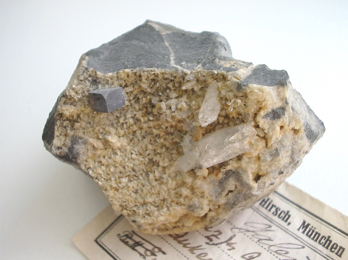 Diese Stufe hat eine beeindruckende "Weltreise" hinter sich. Gefunden wurde sie bei Osnabrück. Das erste Etikett zeigt, dass sie danach im Besitz des Münchner Mineralienhändler Willy Hirsch war. Die Nachträge auf dem Hirsch-Etikett stammen vom Mineraliencomptoir Nerée Boubée in Paris. Sodann wechselte wieder der Besitzer, wie das nächste Etikett beweist. Die Stufe kam in die Sammlungen der Mineralogischen Abteilung der berühmten Pariser Sorbonne. Von dort muss sie nach Bonn, zum Mineralienkontor Krantz gelangt sein, wo sie ein Kölner Privatsammler kaufte, der sie wiederum mit seiner Sammlung an einen Berliner Händler abgab, wo ich sie schließlich kaufte...