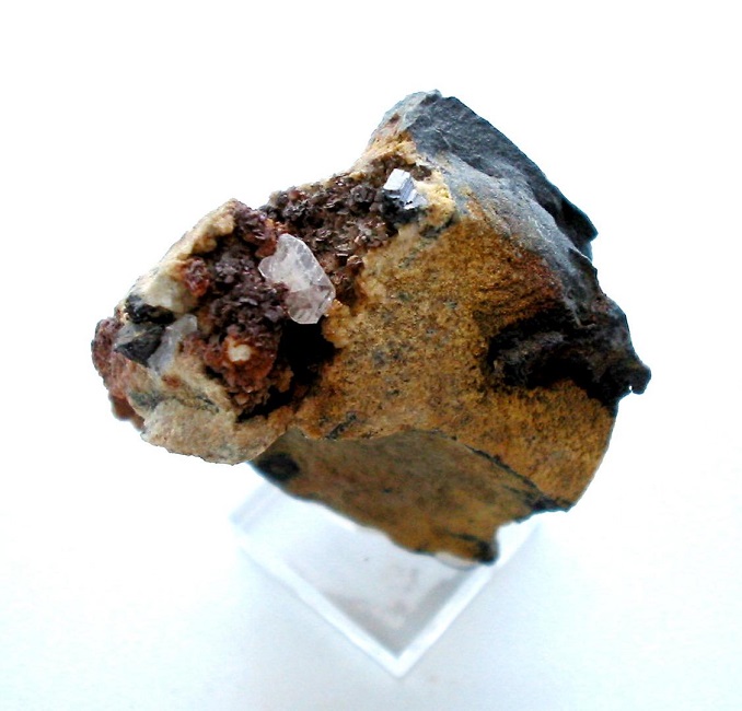 Freistehender Galenit-Würfel (mit Oktaederflächen) von 4 mm Größe mit tafeligen, kleinen Apatiten und Quarzkristallen auf Dolomitrasen im Toneisenstein.