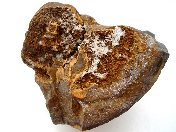 Aragonit als weiße, spießige Kristalle auf limonitisiertem Toneisenstein. Stufenhöhe knapp 8 cm.