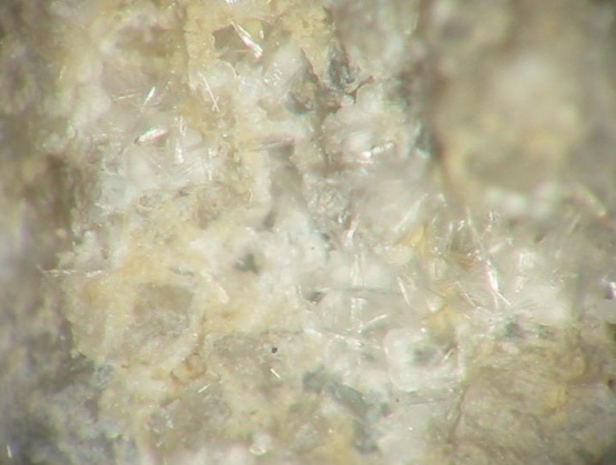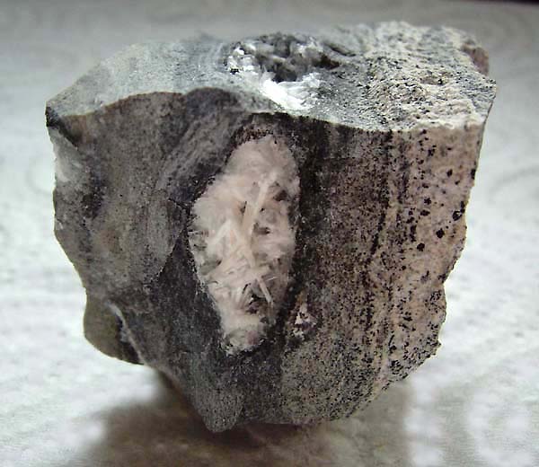 sowie Torbermorit-Rosetten bis 2 cm, neben Erionit, Dolomit, Quarz und Gips.