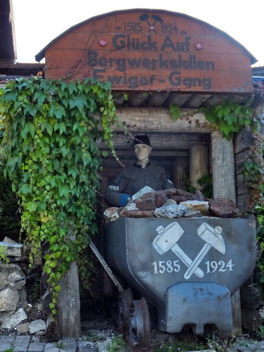 Nachgebauter Stollen mit Grubenhund in Schmelz.Heute ein Ortsteil von Inzell,früher wurden hier die Erze verhüttet.