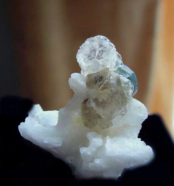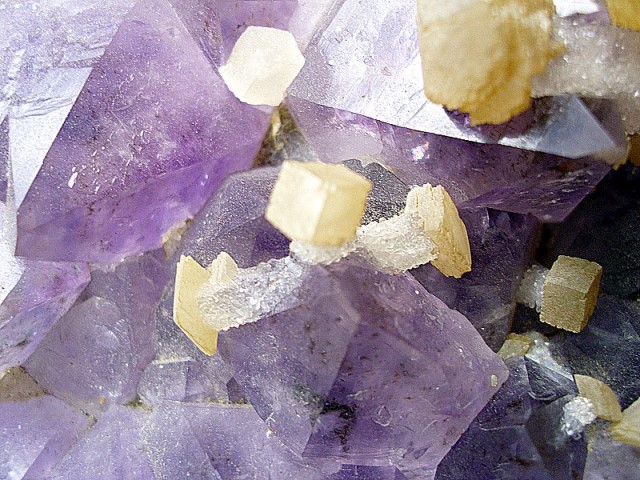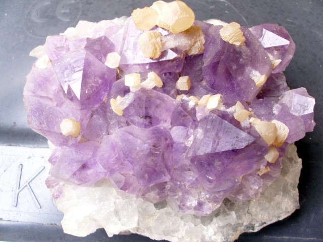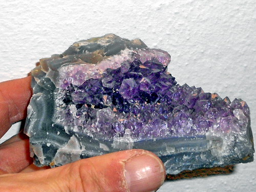Ich habe vor Jahren auf einer Mineralienmesse dieses kleine Bruchstück eines Amethysten erworben, mit kleinen aufgesetzten Calciten.