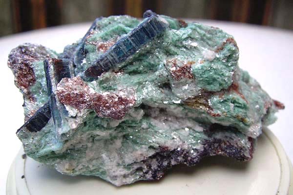 Sehr seltener Plumbomikrolith in oktaedrischen Kristallen bis 1,5 x 1,5 cm (!!), cyanblaue linealförmige Kyanit-Kristalle bis 2,5 cm Länge (!) mit rötlichem Phlogopit und grünem Fuchsit-Glimmer sowie derber, sehr seltener Plumbopyrochlor mit schwarzem Manganocolumbit und grünlich-blauem Amazonit sind hier zu sehen ..