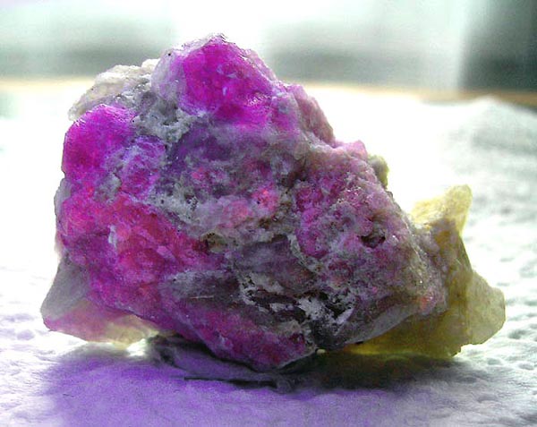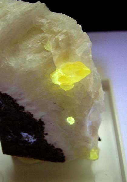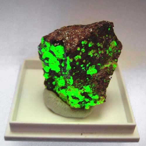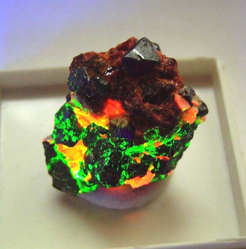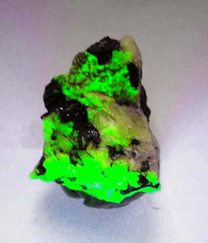 Willemit fluoresziert unter kurzwelligem UV-Licht intensiv grün. Manche Calcite fluoreszieren unter kurzwelligem UV-Licht intensiv rot.