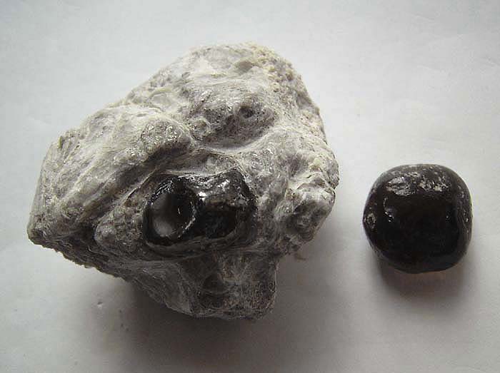 Wenn Obsidian Wasser aufnimmt, verändert er seine Form und wird zu einem grauen, glänzenden vulkanischen Glas mit Schrumpfungsrissen im Muster konzentrischer Kreise. Diese Obsidian-Varietät glänzt wie Perlen und trägt daher die Bezeichnung Perlit.