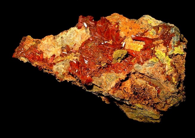 DAS Mineral von Callenberg ist, wie angemerkt, der Krokoit. Dieses relativ seltene und in schönen Kristallen vorkommende Bleichromat wurde in zwei Vorkommen in den Jahren 1977 und 1982 entdeckt und sodann in "großem Stil" abgebaut. Zunächst konnte man sich keinen rechten Reim darauf machen, als der Bagger haufenweise knallrote Brocken freilegte: Realgar, Wulfenit - was sollte es nicht alles sein!