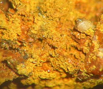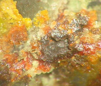 Begleiter des Krokoits ist häufig Coronadit in schwarzen, dicken Krusten, Pyromorphit, meist derb oder in kleinen Kristallen (ganz selten in bis 3 cm großen Prismen) und Mimetesit. Für Systematiker gab´s weitere Chromate wie zeisiggrüne Vauquelinitkrusten, unscheinbarer gelbbrauner Fornacit, kirschrote Phönikochroiteinsprenglinge und Embreyit, teils in orangefarbenen Kristallen! Recht große Cerussite, Plumbogummit als hellblaue Krusten und Vanadinit sind weitere bekannte Minerale aus dieser Paragenese. Hierher gehört auch der äußerst seltene Petterdit, der in fahlvioletten Beschlägen auftritt. Das Blei, was zur Bildung dieser Sekundärminerale vonnöten war, stammt aus dem dem Silicophit eingewachsenen Galenit, zumeist nurmehr als Hohlformen erkennbar. Aus verwittertem Bleiglanz hervorgegangene Bildung konnte auch ganz wenig gediegenes Silber nachgewiesen werden!