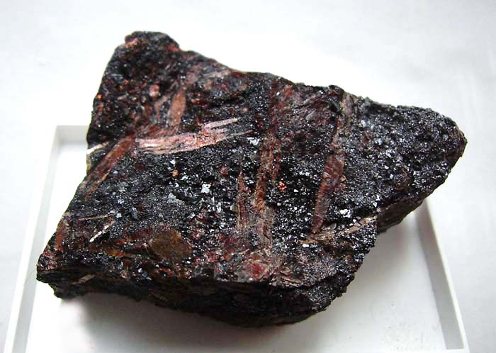 Foto zeigt eine Kleinstufe mit den für das Mineral typischen in Hausmannit-Erz eingewachsenen, leistenförmigen Defernit-Kristallen und Aggregaten aus der Kombat Mine, Kombat, Grootfontein Distr., Namibia.