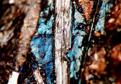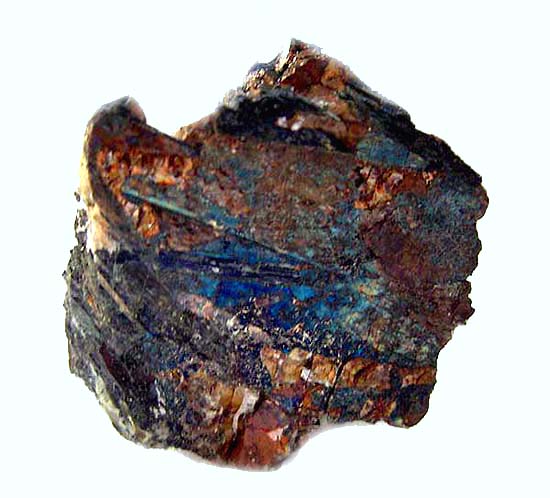 Fotos zeigen eine Kleinstufe mit bunt angelaufenen, metallisch glänzenden Erzpartien von Djerfisherit in Begleitung von Chalkopyrit und Rasvumit.