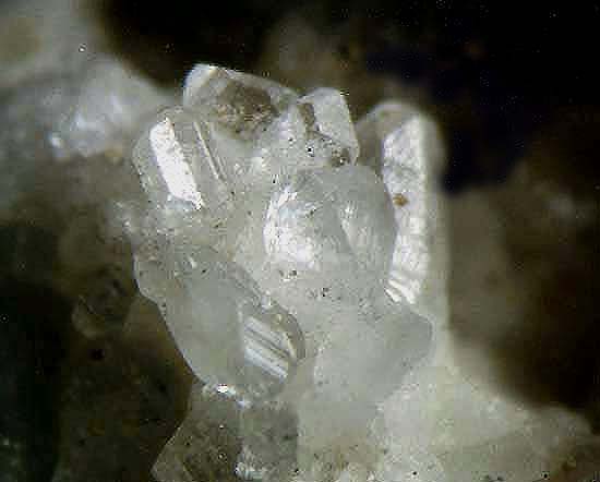 einen Eigenfund aus 1994: Taflig-prismatische Datolith-Kristalle in einem Kluft-Hohlraum aus dem Bärensteinbruch, Radautal, Bad Harzburg, Harz. Bildbreite 8 mm ..