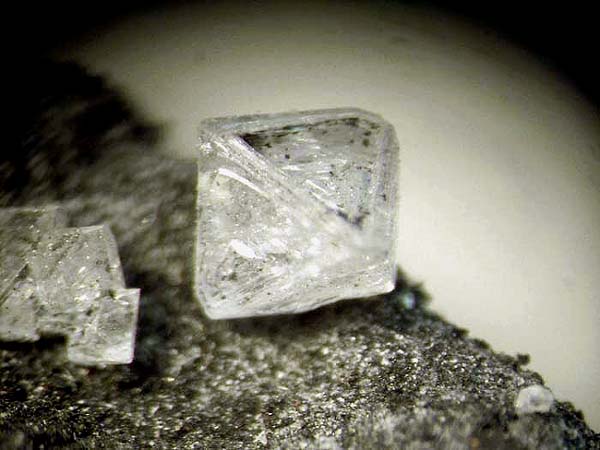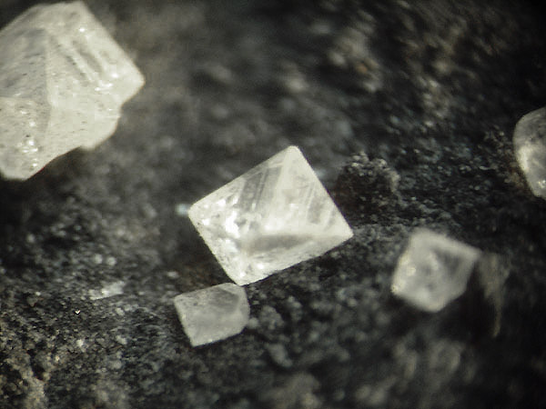 Fotos zeigen sehr gut ausgebildete, 1-2 mm große Arsenolith-Oktaeder auf Kohle - im Kleinstufen-Format - von der dafür bekannten Fundstelle La Ricamarie, Saint-Etienne, Loire in Frankreich.