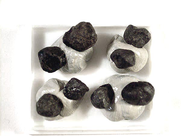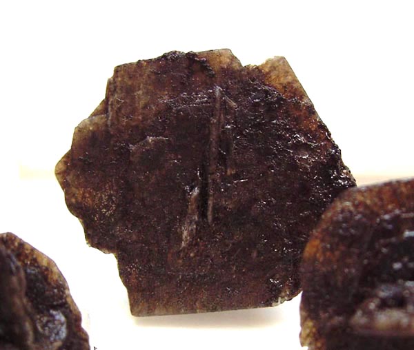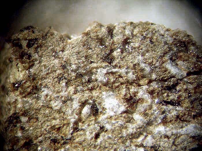 Oldhamit - CaS - Tritt in kleinen rundlichen Körnern auf, die nach allen drei Richtungen vollkommen spaltbar sind. Oldhamit ist durchsichtig, leicht walnussbraun und zeigt orangefarbene Phosphoreszenz. Es löst sich leicht in Säuren und wird auch bereits durch kochendes Wasser zersetzt. Auch in der Luft oxidiert es sehr leicht. Kommt in Stein- und Eisenmeteoriten vor. In länger lagernden Meteoriten, die im Erdreich mit Wasser in Berührung kommen, zersetzt sich Oldhamit zu Gips. Deshalb sind die Körner oft von einer Gipsrinde umzogen, obwohl Gips primär in Meteoriten nicht vorkommt! Ist aus irdischem Gestein nicht bekannt, entsteht jedoch bei einigen Hüttenprozessen.