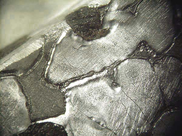 Plessit, Fülleisen - füllt bei oktaedrischen Eisenmeteoriten in der Regel die Lücken zwischen den Lamellen aus - ist also allseits von Taenit umsäumt!