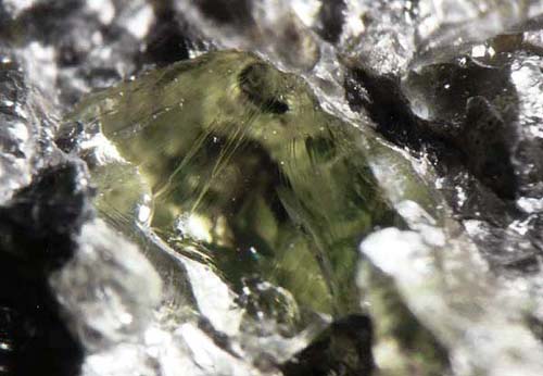 Olivin - (Mg, Fe)2[SiO4] - tritt in Meteoriten recht häufig auf, vor allem in den Pallasiten (Steineisenmeteoriten) in Form großer gerundeter Körner. Wurde u.a. auch in Höhlungen des historisch bedeutenden "Pallas-Eisens" von 1749 gefunden.