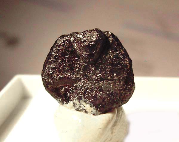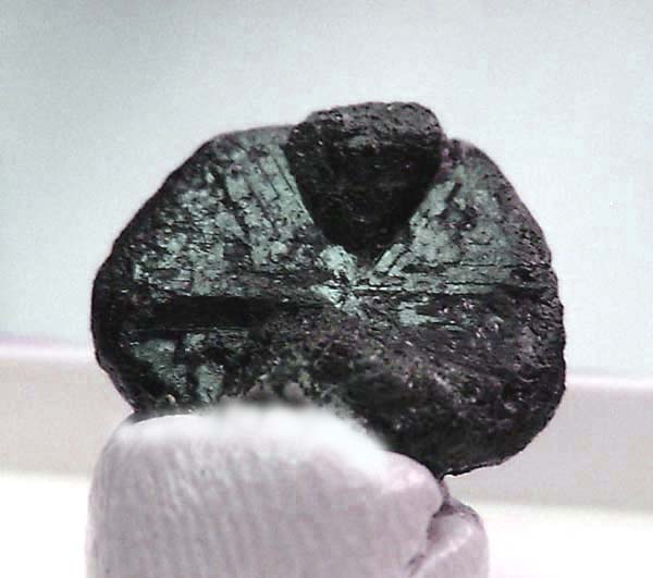 Alexandrit als typisch zyklischen Kristall-Vielling von 1,8 x 1,5 cm Durchmesser. Erkennbares Changieren (Farbwechsel) von grün (Tageslicht) nach rot (Kunstlicht) (!)