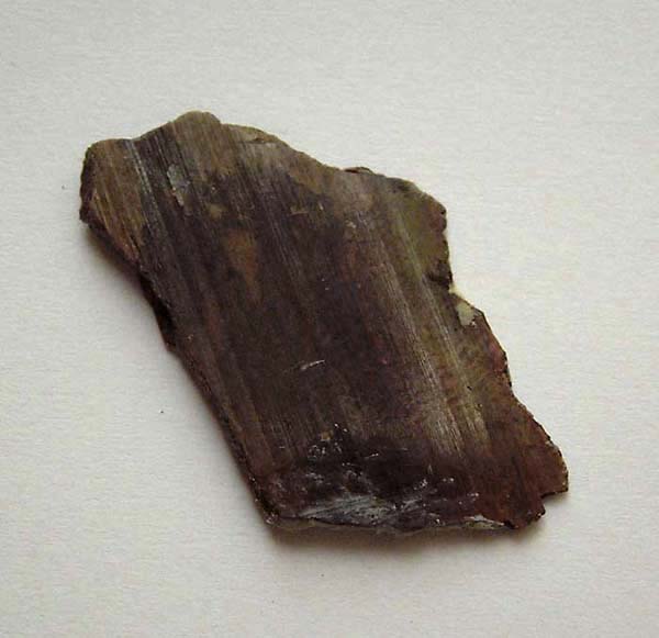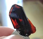 einen schwarzen, leuchtend rot durchscheinenden Brookit-Kristall von 2 x 1 cm Größe aus Kharan, Balochistan, Pakistan.