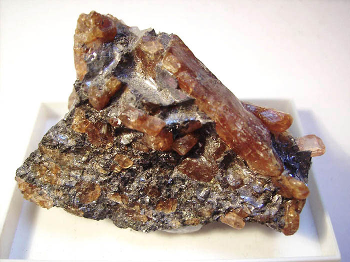 Fotos zeigen zwei Seiten einer größere Kleinstufe aus meiner Sammlung mit reichlich kurz- bis langprismatischen Bustamit-Kristallen bis max. 2,6 cm Länge (!!). Auf den Fotos sichtbarer Begleiter ist Galenit (Bleiglanz). Die Stufe liegt daher auch entsprechend schwer in der Hand.