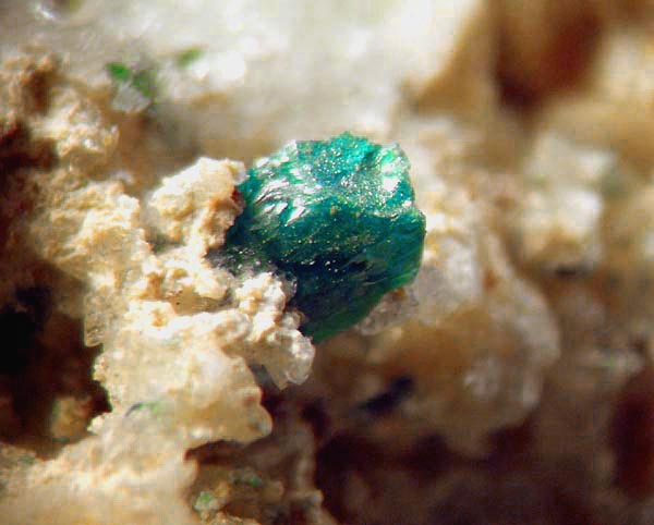 Fotos zeigen einen im Jahr 1960 gefundenen, schönen kurzprismatischen Bellingerit x von 1 mm Größe in Gips aus der Chuquicamata Mine des gleichnamigen Distr., Calama, Antofagasta Prov., Chile.