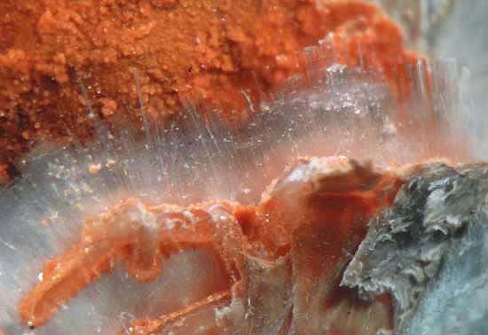 Foto zeigt kontrastreich farblosen, nadligen Artinit xx in Begleitung von schönem orangefarbenem Desautelsit xx - Mikroskop-Aufnahme, Bildbreite 6 mm.