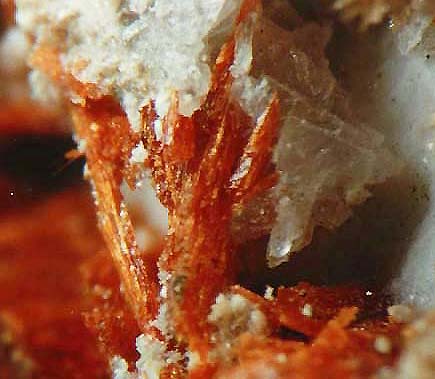 Foto zeigt seltene leuchtend orangefarbene, lamellenartig längliche Saneroit-Kristalle mit Baryt. Mikroskop-Aufnahme, Bildbreite: 6 mm.