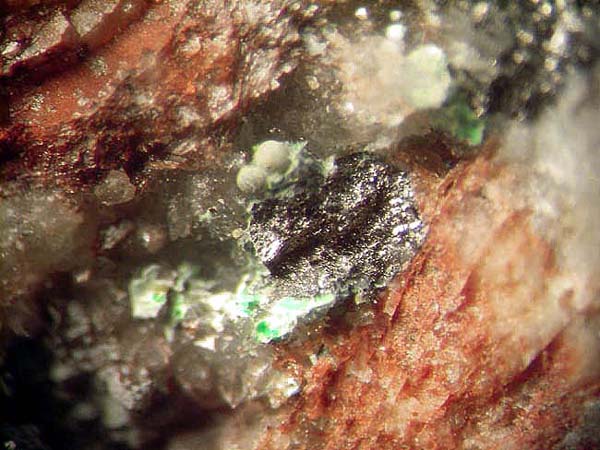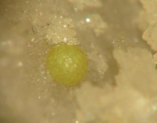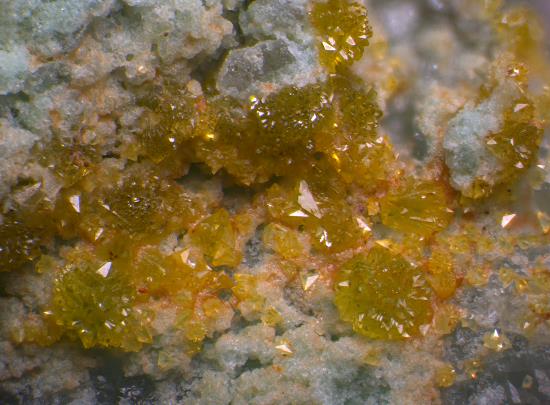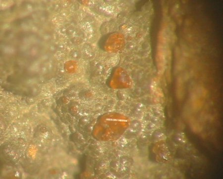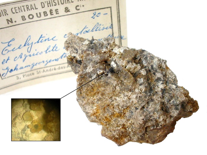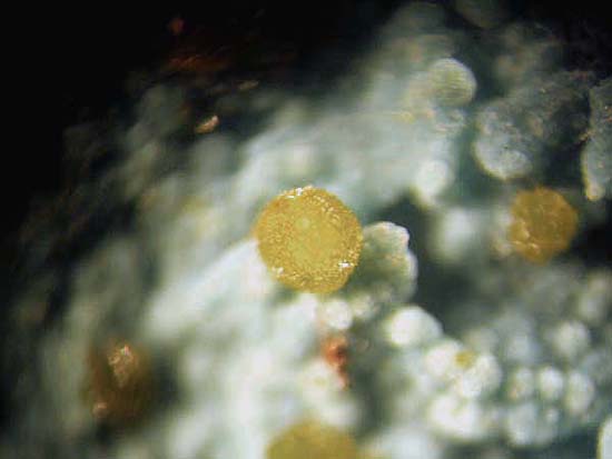 Fotos zeigen Eulytin-Kugeln bis 1 mm Durchmesser in Begleitung von Chrysokoll