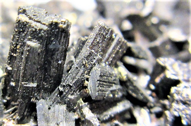 Foto zeigt eine fast handgroße Stufe mit schönen Enargit-Kristallen in Begleitung von Tennantit aus Peru.
