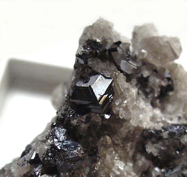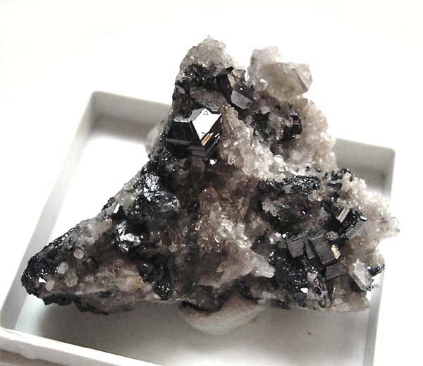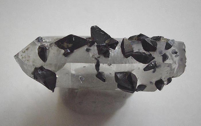 Foto zeigt schwarze bipyramidale Anatas-Kristalle bis 6 mm Länge auf Bergkristall