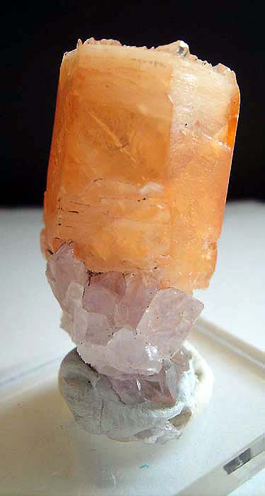 auf apfelsinen-rotem Calcit-Spaltstück von 3,5 x 2,5 cm Größe