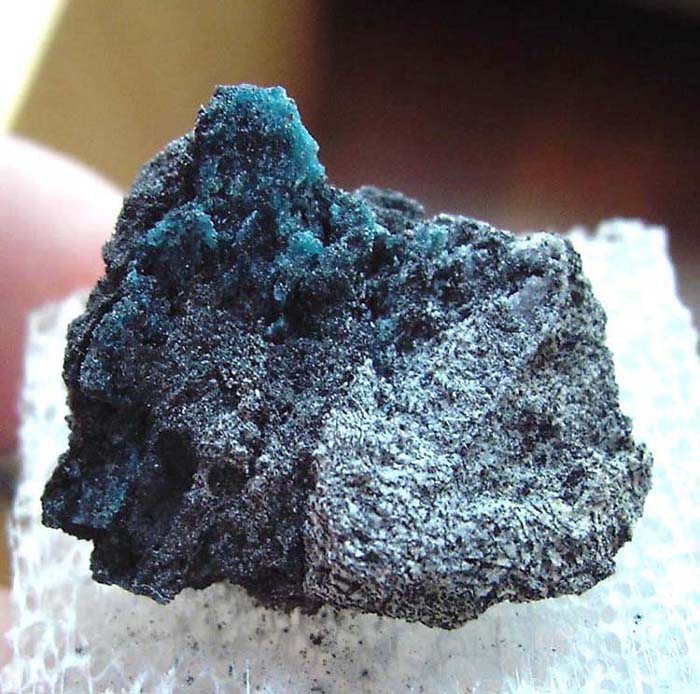 1. Foto zeigt eine Kleinstufe mit blauer kristalliner Kruste von Fluorellestadit bis 1 cm Größe in Begleitung von schwarzem Srebrodolskit u.a. auf Sandstein