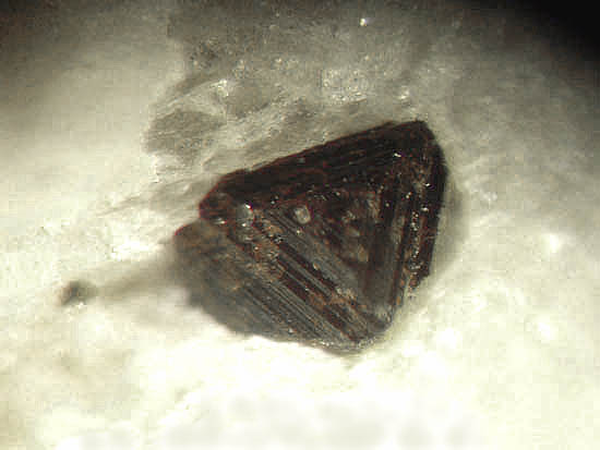 Fotos zeigen einen ansprechenden 1 mm großen Kristall von Fergusonit-(Y) aus dem Laacher See Komplex von Mendig in der Eifel.