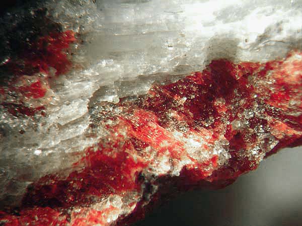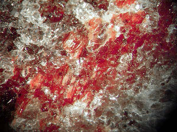 Fotos zeigen jeweils einen Kleinstufen-Ausschnitt mit rotem Gillespit in plattigen Partien und weißem massivem Sanbornit von Tres Pozos, Baja California, Mexiko (BB jeweils 6 mm).